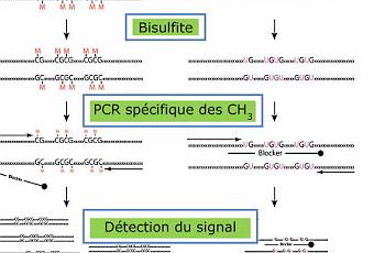 Détection du cancer colorectal: Schéma récapitulant les différentes étapes du test Septine 9, de l'extraction de l'ADN du plasma (patient atteint d'un cancer colorectal à gauche versus un individu sain servant de témoin à droite) à la détection de la PCR spécifique des méthyles (CH3) et du variant_v1 du gène de la septine 9. In Immuno-analyse et Biologie Spécialisée Volume 28, Issue 1, February 2013, Pages 1-7
