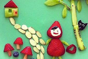 Une superbe assiette que j’ai découverte aujourd’hui ! Il s’agit d’un food art d’Idafrosk qui représente le conte du petit chaperon rouge ! On reconnait le chaperon rouge en fraise, le loup caché derrière un arbre en kiwi, e la maison de la mère grand au loin ! Super bien réussi !
