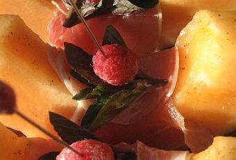 Essorer le cantaloup et le poivrer légèrement. Arroser d'huile d'olive à l'orange ou à défaut de jus de citron. Entourer chaque quartier d'une tranche de jambon, piquer à l'aide d'une petite brochette en insérant d'abord un bouquet ou une feuille d'herbe fraîche et une framboise, si désirée. Arroser l'assiette d'huile et poivrer à nouveau. Servir.