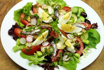 salade, Nice, tomates, entrée, basilic, anchois, huile d'olive, artichauts, olives, févettes, légumes, cébette Variations Gourmandes