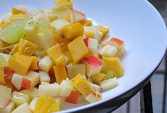 Quel délice que cette petite brunoise matinale fruitée !Le petit plus qui fait toute la différence... La lime ! Couper les fruits choisis en brunoise et la lime en suprêmes.Mélanger ces trois ingrédients avec une pincée de fleur de sel et le zeste de lime. Pour finir, laisser tomber quelques gouttes d'huile d'olive verte sur les fruits au moment de servir et voilà ! Pour les fruits, j'ai opté ce matin là pour une pomme ambrosia et une mangue ataulfo. L'huile d'olive verte, c'est celle de La Belle Excuse, ma préférée à ce jour à Montréal !