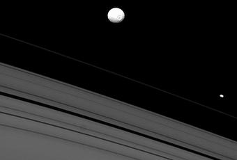 Animation créée par l’excellente Emily Lakdawalla membre de The Planetary Society (son blog est à visiter ici) à partir des images capturées par Cassini. La sonde spatiale en orbite autour de la géante Saturne se déplace en direction du plan des anneaux. Au loin, on distingue deux de ses satellites naturels : Mimas – qui, avec son cratère géant, ressemble à s’y méprendre à l’étoile noire de la saga “Star Wars” en version blanche – croisant en apparence la petite Pandora, bloc de roches gravitant en bordure de l’anneau F, le plus extérieur de tous. A noter que Mimas ne s’abaisse pas vers les anneaux, il s’agit en réalité du mouvement du vaisseau Cassini.