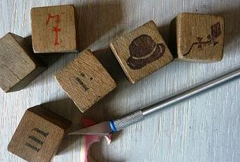 Je poursuis mes amusements avec la gomme à graver que m'avait envoyée La Tulipe (le précédent, c'était ici). Ces petits cubes de bois qui m'attendent patiemment, depuis des années, dans mon tas récup' se sont avérés être de chouettes supports.