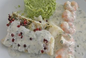 Au moment de servir, présenter à l'assiette avec un cercle de purée de brocoli, une part de poisson, quelques crevettes et napper de sauce.