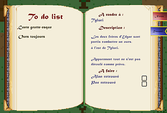 J'ai aussi l'intention (un jour) de mettre le menu et les options dans le journal histoire d'uniformiser un peu l'interface. Je jetterai aussi un oeil à l'inventaire mais je ne pense pas qu'il y ait moyen de le faire tenir dans le journal.