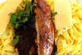 Commencer par faire cuire la garniture : ici des taglialelle qui cuisent environ 6 minutes. les disposer au fond des assiettes et les agrémenter d'un léger filet d'huile d'olive. On ajoute un copeau de granan padano ...