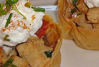 Retirez les filets de la poêle, et coupez-les en petits cubes de 1 cm. Mélangez ensemble 2 cuillerées à soupe d'herbes ciselées (menthe,ciboulette, cerfeuil et persil), de pistaches hachées . Disposez un moule de feuilles de brick par assiette, et répartissez-y les dés de poulet. Agrémentez de crème entière fouettée et saupoudrez d'herbes et d'épices.