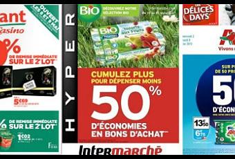 Avec +7% de catalogues en 2012 par rapport à 2011, pas d’inquiétude, votre boite à lettre va bien. Les pages de couverture sont claires, et affichent en géant le taux promotionnel du moment, avec la plupart du temps, des taux supérieurs ou égaux à 50%. En 2012, 72% des catalogues ont affiché une promesse chiffrée, Casino, Auchan, Géant et Carrefour Market remportant la palme du plus grand nombre de semaines.