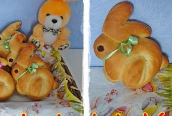 A l’aide d’un pinceau, badigeonner les lapins avec un jaune d'oeuf dilué avec 2cc d'eau ... perso: du lait sucré. Enfourner 15 à 20 min dans le four préchauffé à 180°.