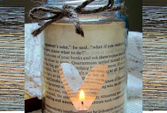 Il vous faut : un petit pot en verre, de la ficelle, du papier journal et une bougie chauffe-plat. Découpez un rectangle de papier journal de la circonférence du pot puis, au ciseau, découpez également 2 coeurs dans le papier. Positionnez le papier à l’intérieur du pot, déposez la bougie, et faites un noeud avec la ficelle autour de l’ouverture.