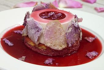 J'ai choisi de préparer l'appareil à bavarois sans utiliser de crème anglaise, mais plutôt une base de crème infusée à la rose et de pâte d'amande, collée ensuite à la gélatine, puis additionnée de crème fouettée. J'ai déposé les bavaroises sur un sablé (type sablé breton), nappé et cerné d'un miroir "rose et betterave", et je les ai décorées de pétales de roses cristallisées.