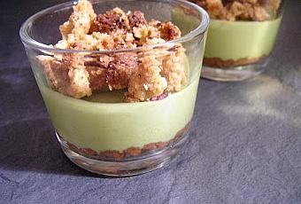 J'adore la pistache alors j'ai adoré ces verrines! Avec un peu d'organisation, c'est rapide à réaliser : on fait le croustillant que l'on fait prendre pendant la préparation de la mousse. Pendant que la mousse refroidit on découpe le croustillant et on monte les verrines. Le crumble se conserve très bien dans une boite métallique alors il peut également être préparé à l'avance. On peut laisser les verrines au congélateur plusieurs jours et faire le montage au dernier moment.