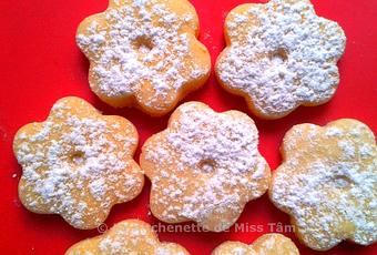 - Enfourner à mi-hauteur sur une plaque à pâtisserie recouverte de papier de cuisson, à 170°C pendant 15 minutes environ. Bien surveiller la cuisson, la surface doit rester claire. Une fois refroidis, saupoudrer les biscuits de sucre glace.