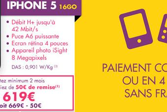 L'iPhone 5 d'une capacité de 16 Go, en noir ou blanc, est donc proposé à 669 € avec une remise de 50 €, soit 619 €
