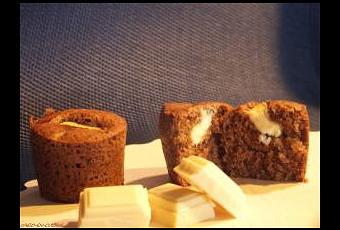 Ajoutez le chocolat en poudre au mélange et mélangez, puis remplissez les moules de pâte jusqu'à mi hauteur, terminez par un carré de chocolat blanc puis enfournez environ 20minutes les muffins doivent être bien gonflés mais souples au toucher.