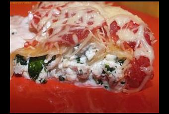 Ajoutez la crème fraîche autour des cannelloni et la sauce tomate sur les cannelloni. Garnissez de gruyère.