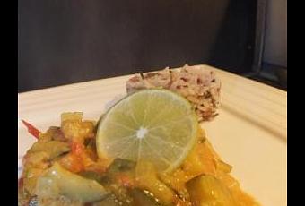 Ajoutez les épices à colombo. Laissez cuire à feu doux durant 20 minutes environ. Avant de servir ajoutez le jus d'un demi citron vert et la crème fraîche afin de lier la sauce.
