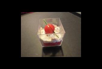 Dans des verrines, disposez au fond les dés de tomate. Puis poursuivez avec la crème. Enfin terminez par une tomate cerise et un brin de ciboulette.