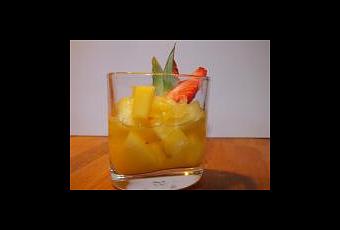 Versez le sirop sur les fruits. Décorez avec une fraise et une feuille d'ananas