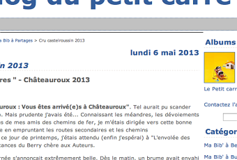 Tout d’abord, le 6 mai dernier, le Blog du petit carré jaune relate son passage au salon du livre de Châteauroux et en voici son résumé.