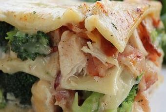 5)Mettre un peu de crème de poulet diluée dans le fond du plat, mettre un étage de pâtes et ajouter le poulet cuit avec le bacon, le brocoli et le fromage cheddar fort. Mettre des pâtes à lasagne et couvrir de crème de poulet.