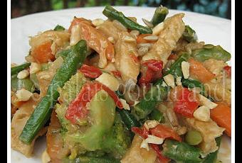 Dans un grand faitout, chauffer un peu d'huile et y faire revenir les légumes jusqu'à ce qu'ils soient légèrement tendres mais encore un peu croquant, réserver. Faire cuire le poulet, rajouter les légumes et verser la sauce satay dessus, bien mélanger le tout et servir.