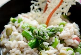 Le printemps, l’arrivée des asperges (vertes, mes préférées!), les premières fèves… risotto?! Avec des miettes de jambon grillé pour une note fumée, et une liaison au beurre et parmesan…