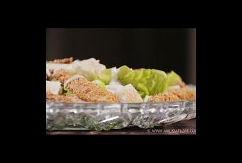 9. Vous pouvez maintenant dresser votre assiette. Pour cela, commencez par mettre la salade émincée. Puis ajoutez les aiguillettes de poulet, les croûtons, des copeaux de parmesan et finissez par arroser de sauce Caesar Heinz®.