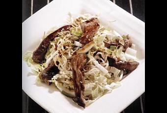 - Émincer le chou chinois et les ciboules. Mélanger le chou avec les ciboules, les nouilles chinoises et les germes de soja. Ajouter les aiguillettes, la marinade et le vinaigre de riz. Au moment de servir, parsemer la salade de canard de graines de sésame grillées.