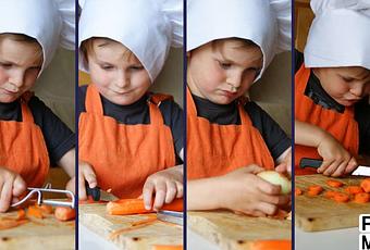 Commencez ensuite par éplucher les carottes (2) et coupez-les en morceaux.