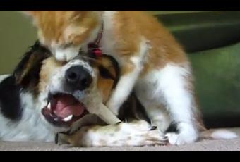 Impossible pour ce brave toutou de manger son os tranquillement. C’est parfois très chiant un chaton…