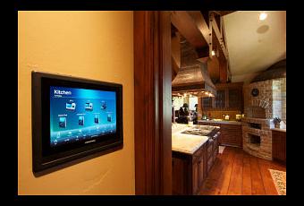 Cette installation de cuisine, par Lifestyle Electronics, montre une GUI personnalisée dans un écran tactile mural. Si vous regardez au plafond, vous verrez également un haut-parleur « architectural ».