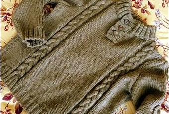 Manches : il est recommandé de les tricoter ensemble sur la même aiguille avec deux pelotes distinctes afin d’être certaine de les faire symétriques. Monter 52 mailles, tricoter 12 rangs de côtes 2/2 (aiguilles 3). Continuer avec les aiguilles n°3,5 en augmentant d’une maille et en positionnant la torsade au milieu. Tricoter droit en augmentant de chaque côté 1 maille (8 fois). Creuser les emmanchures lorsque la manche atteint une hauteur totale de 31 cm, comme pour le devant et le dos. Réaliser la tête de manche en rabattant ensuite de chaque côté 1 fois 3 mailles, 3 fois 2 mailles, 7 fois 1 maille (tricoter deux mailles ensemble à une maille des bords), 2 fois 2 mailles 2 fois 3 mailles. Rabattre en une fois les mailles restantes à l’envers sur l’endroit.