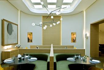 Que nenni, car il nous suffira de traverser le hall au sol de marbre noir et blanc, une enfilade sobre et majestueuse, et pousser jusqu'à cette salle toute de bois blond, moquette vert olive, et coins intimistes concoctés par l'architecte d'intérieur Pierre Yovanovitch, pour nous séduire et nous émouvoir. Accueil ni effacé, ni pesant, d'un personnel hyper discret, mais suffisamment présent pour nous accompagner en un coin alcôve, coussins panthère et table ronde, pas de quoi déprimer, je vous rassure ! L'œuf poché, frisée fine aux lardons de saumon fumé, la pomme de terre ratte tiède en salade, Cécina, parmesan, et le pressé de foie gras et bœuf aux artichauts, feront montre d'un savoir-faire indéniable, celui d'un chef, Filipé Da Assuncao, Meilleur Ouvrier de France, un MOF ô comme ils disent …