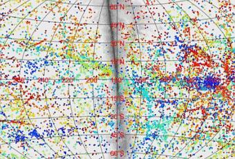 Ci-dessous, comme pour l’animation d’entête, une carte montrant toutes les galaxies dans l’univers proche. Chaque galaxie dispose d’un code couleur pour indiquer sa distance, du bleu pour les plus proches et rouge pour les plus éloignées, jusqu’à 300 millions d’années-lumière. (Université d’Hawaii)