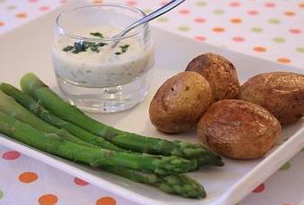 - Disposer les pommes de terre rôties et les asperges dans les assiettes. Servir avec la crème de ciboulette bien fraîche.