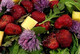 Salade de fraises, ananas, basilic et graines de fenouil avec pleins de verdures et fleurs de ciboulette