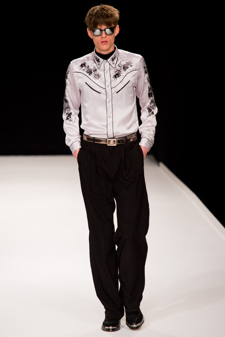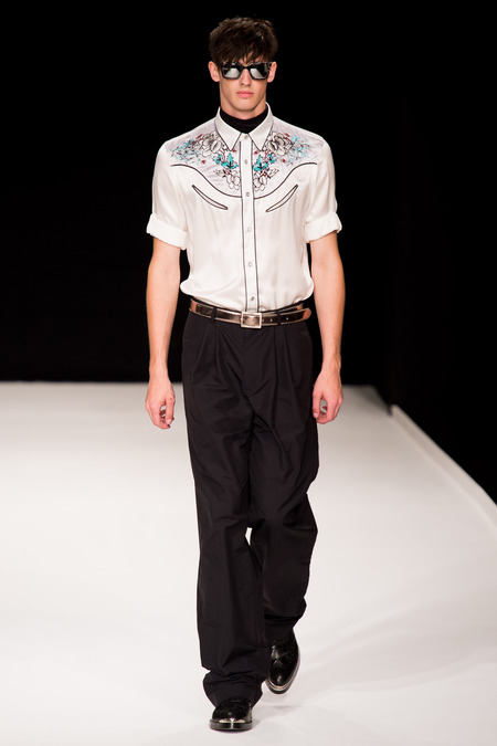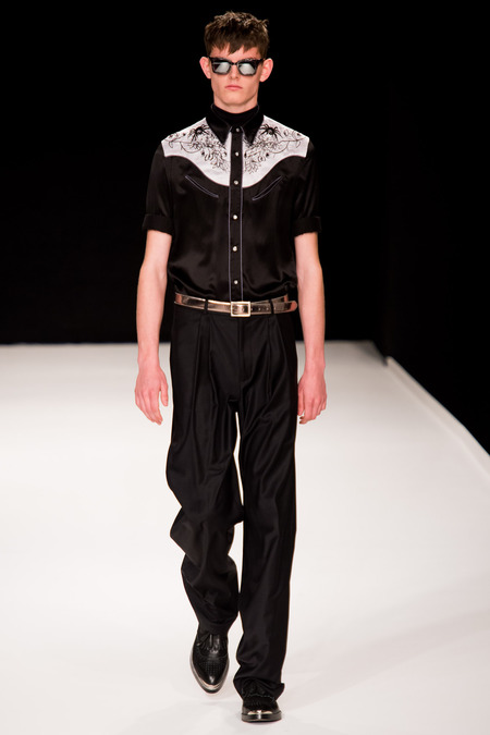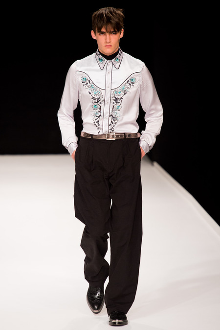Hihaaaaaa !!!Les cowboys sont de sortis chez Topman, et je ne sais pas pour vous mais y'avais comme un air d'Isabel Marant à ce défilé Topman Design.Des chemises brodées de fleurs, des ceintures gold et des creepers sur pantalon noir large parce que quand même on est à Londres et l'esprit punk couture n'est jamais très loin. Du chic et du décontracté, sortez vos lassos et sauter sur vos montures pour attraper la mode au vol...