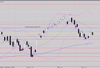 Peut-être devrons-nous corriger le récent rebond par un retracement de 62% correspondant exactement au support des 3790 points sans pour autant mettre ce rebond en danger grâce à la figure en contre-attaque haussière du 13 juin.