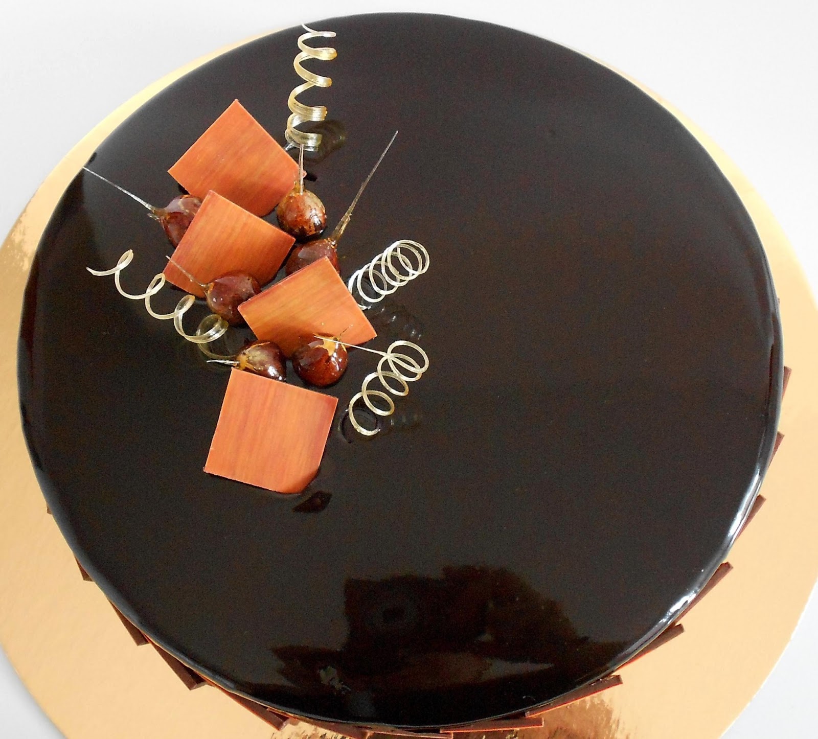 Il s'agit d'une mousse au chocolat noir avec un insert crémeux à la pâte de noisette, et deux disques de dacquoise noisettes-orange. Le tout recouvert d'un glaçage miroir noir au cacao 22%.