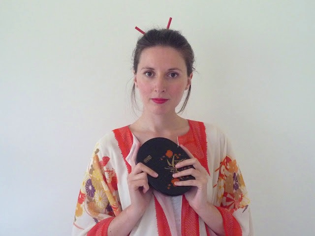 J'ai voulu m'amuser avec mes baguettes dans le chignon mais j'ai évité tout autre accessoire pour éviter l'effet clownesque et ne pas polluer le kimono déjà bien orné.