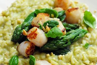Risotto très crémeux aux asperges et noix de saint jacquesIngrédients : 1 douzaine de belles noix de saint jacques ou une vingtaine de plus petites -1 botte d’asperges vertes - 5cl de crème liquide - 300gr de riz à risotto – 4 échalotes - 10cl de vin blanc - 1l de bouillon de volaille - 50gr de beurre - 3cl d’huile d’olive – quelques feuilles de basilic – 1càs de pignons hachés - sel et poivreEnlevez les petites feuilles sur la tige des asperges, casez les pieds. Coupez les têtes et mettez-les de coté puis coupez les tiges en tronçons de 2cm.Faites bouillir une grande quantité d’eau salée et faites-y cuire les têtes 3mn, puis rafraîchissez-les dans l’eau glacée et égouttez-les. Cuisez ensuite dans la même eau les tronçons des asperges pendant 10mn.Dans le bol du robot, mettez les tiges d’asperges et la crème. Mixez jusqu’à obtenir une purée très fine. Rectifiez l’assaisonnement en sel et poivre, réservez.Préparez le risotto, épluchez et ciselez l'échalote en petits dés. Dans une casserole versez un filet d’huile d’olive et faites suer l’échalote. Ajoutez le riz, remuez pendant 1ou 2 minutes, le temps qu'il soit bien nacré. Déglacez en versant le vin blanc et laissez réduire. Ajoutez au fur et à mesure le bouillon jusqu’à cuisson complète du risotto, comptez une vingtaine de minutes. Pendant que le riz cuit, mettez une poêle à feu vif et faites-y saisir les coquilles saint jacques très rapidement dans un filet d'huile ou dans un peu de beurre.