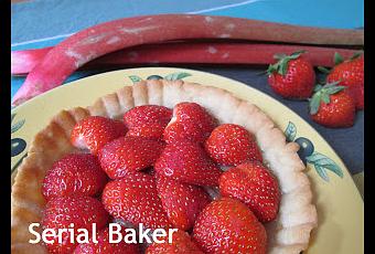 - une pâte sablée (ma recette de pâte sablée ici)- 1 barquette de fraises- 700g de rhubarbe- sucreEplucher la rhubarbe et la couper en tronçons. Placer la rhubarbe dans une casserole avec 100g de sucre. Laisser dégorger la rhubarbe pendant 1 heure. Puis faire compoter la rhubarbe à feu moyen en remuant de temps en temps pendant 20 min environ. Si la compote est trop liquide, poursuivre la cuisson à feu doux pour faire réduire. Goûter et rectifier en sucre si la compote est trop acide. Laisser refroidir un peu. Etaler la pâte. Foncer un moule. Piquer légèrement le fond de tarte avec une fourchette. Recouvrir le fond de tarte de compote de rhubarbe et cuire au four (th6/180°C) pendant 30-40 min environ. La pâte doit être croquante.Laisser refroidir complètement. Laver et équeuter les fraises. Les couper en deux et les répartir sur la tarte. Vous pouvez préparer cette tarte quelques heures à l'avance, mais pas trop longtemps en avance car la pâte risque de ramollir.