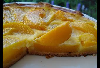 Sortir le fond de tarte du four, éparpiller les lamelles de pêche, verser dessus le mélange à l'orange et hop! 15 minutes au four encore.