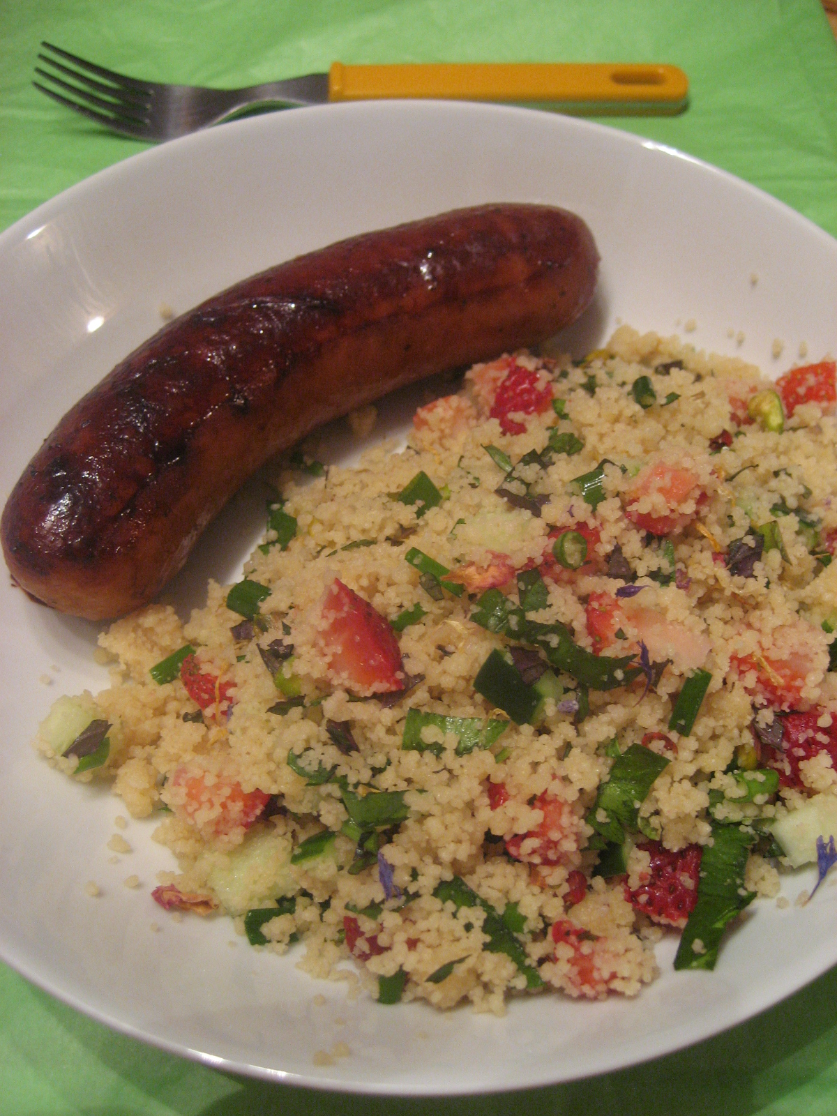 Pour faire un petit raz-de-marée d'été sur le taboulé et le couscous. Pourquoi ne pas lui ajouter des herbes fraîches comme la livèche et des fleurs comestibles, fraîches ou séchées, de même que des fraises mais encore?... Le clou ou plutôt l'ingrédient absolument indispensable de cette combinaison: le poivre rose. Cette merveilleuse petite baie au goût légèrement fruité. Un petit bol qui ferait plaisir même à l'heure du déjeuner!