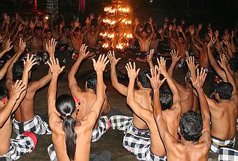 Le Kecak (prononcé "Ketchak") est un choeur de percussions vocales balinais accompagnant originellement des transes lors de rituels.