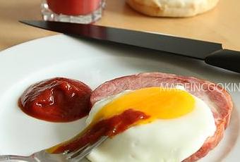 - Dresser l'assiette en ajoutant une bonne cuillère à soupe de ketchup pour commencer. Placer ensuite le bacon puis l'oeuf au plat par dessus.