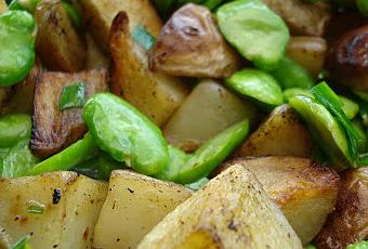 Ici, il y a donc des pommes de terre nouvelles (les jeunettes, qu'on mange avec la peau, les meilleures selon moi). Et des fèves. C'est tout. Bon non, j'avoue, il y a aussi de la graisse de canard, deux feuilles d'un pied d'ail resté en terre et un peu de sel. Mais sinon, c'est tout, je vous le jure.Pour les pommes de terre, c'est bien simple, on les choisit petites et on les coupe en 4 ou en 8. On fait chauffer 1 cuillerée à soupe de graisse de canard dans un faitout et on les met à dorer à feu moyen, tranquille Emile et on attend.