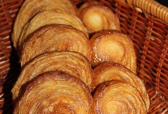 10/ Pour le façonnage, étaler la pâte en un rectangle de 5 mm d'epaisseur, saupoudrer de sucre et rouler un premier boudin jusqu'à la moitié, puis de l'autre cote faite de même , couper des tranches fines et placer sur une feuille de cuisson, saupoudrer à nouveau de sucre et enfourner 25 minutes à 180 ° en retournant les palmiers à mi cuisson, (A adapter en fonction du four, il faut que les palmiers soient bien dorés )