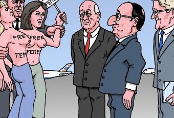 Elles étaient là, au Salon du Bourget, arborant leurs seins nus pour soutenir leurs homologues emprisonnées en Tunisie. Jean-Yves Le Drian, notre Ministre de la Défense et François Hollande ont du apprécier le spectacle !